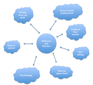 Students select one of our four outcomes and put it in the center of the cluster map on the white board in our room. They branch out and make a list of subtopics that include activities, genres, processes, or past writing projects that may have contributed to their development with that outcome.
