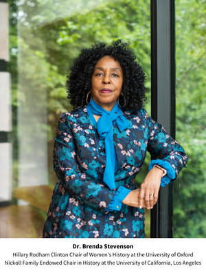 Brenda Elaine Stevenson (PhD, Yale University) is the inaugural Hillary Rodham Clinton Chair of Women’s History at the University of Oxford and the inaugural Nickoll Family Endowed Chair in History at the University of California, Los Angeles. She is the author of the award-winning monographs: Life in Black and White: Family and Community in the Slave South; and The Contested Murder of Latasha Harlins: Justice, Gender and the Origins of the L.A. Riots. She is also the author of What Is Slavery?; the editor of the Journals of Charlotte Forten Grimké; and the co-author of The Underground Railroad. Her new monograph, What Sorrows Labour in My Parent’s Breast?: A History of the Enslaved Black Family, appeared in April 2023. She was appointed by President Biden to serve on the Civil Rights Cold Case Records Review Board in 2022. When she is not teaching or writing, she is an avid gardener and teaches Sunday school to what she describes as “adorable six and seven year-olds”.