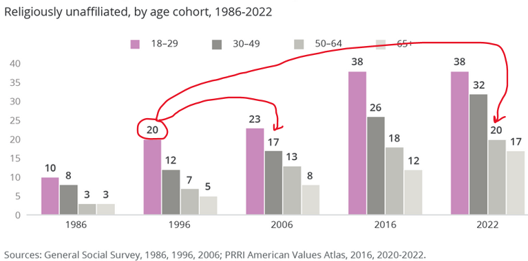 In Public Religion Research Institute data, below, depicting generation gaps in religiosity over time, I found more evidence of the cohort/generational effect. Note that in 1996, 20 percent of people in their 20s were religiously unaffiliated; 10 years later, 17 percent of people in their 30s were the same; and, 26 years later, 20 percent of people at roughly midlife, were religiously unaffiliated.
